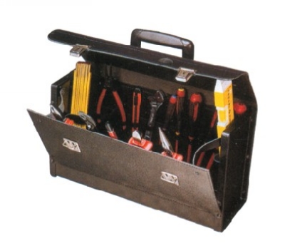 牛皮结合ABS工程塑料。 不含工具。 类型: 前后部工具板带可调节工具扣。 旁边工具板有固定工具扣。 内部全钢筋。 搭扣,附背带扣。