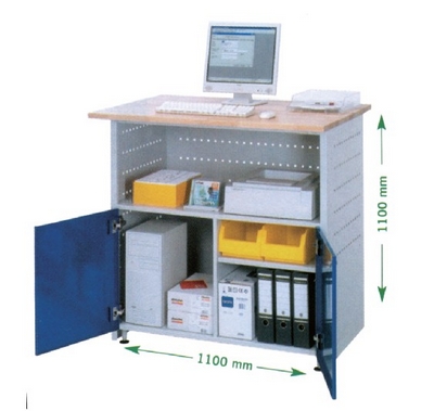 尺寸: 宽 1100×深 800×高 1100 mm。 实心操作面 宽 1100×深 800×高 25 mm 带漆表面, 圆形边角。 稳定和扭转自由钢板结构。 开放式货架, 高 370 mm ,柜体后部可接电源线及有线电视线。 底柜为双叶门(可上锁) 分为两个储物空间 (170 和 330 mm)。 可选固定式(通过底座可水平调整) 或者移动式(有2个固定脚轮和2个旋转脚轮)。 柜体: RAL 7035 浅灰, 门: RAL 5010龙胆蓝。 柜体:RAL 7016 煤灰色, 前面板 RAL 5012 浅