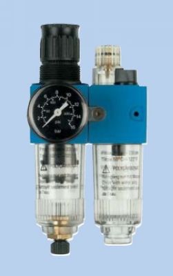 蓝色模块组合气动三元件;40μm滤芯配置;半自动排水 备注:①G1/8和G1/4有5μm规格可特殊订购 ②0-16巴和0-25巴可特殊订购