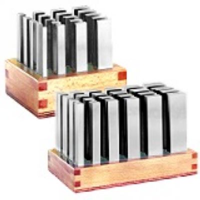 In wooden stand. Plain parallel, fine-ground, in pairs. Size data on front of product. Sets offer a large range with 1 mm graduation. Case-hardened. Pair tolerance tp at height IT 5. Rated dimensional tolerance in height and width to DIN ISO 2768m. Remain