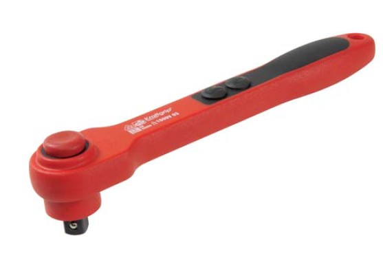 装插各种1/2”的电工绝缘套筒拆装螺钉螺母 可通过按钮锁住或松开装插的套筒套头 手柄上有正反转按钮 体积小,可在狭小空间作业 结构坚固,使用寿命长 1000 V 以下安全作业 和 VDE GS 标识