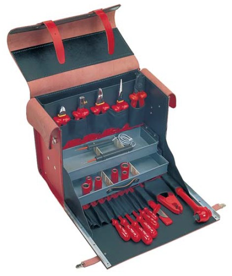 有滑动锁的红色皮箱,铝包边 箱子上印着 1000 V 工具
